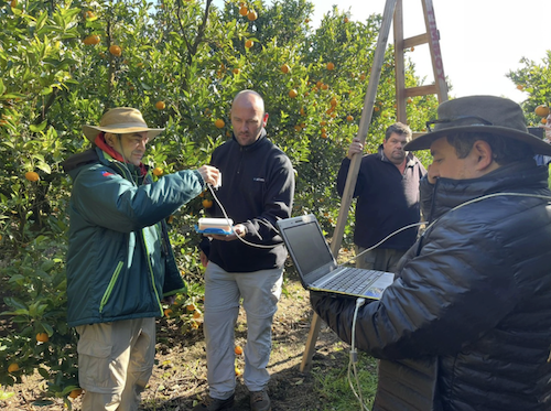 Se realizaron mediciones mediante un espectro radiometro +2000 bandas y cámaras infrarrojas en lotes de cítricos para calibrar y validar un modelo de monitoreo remoto para HLB combinando el uso de firmas espectrales de plantas sanas y enfermas de HLB e imágenes satelitales. La actividad se llevó a cabo entre el 25 de junio y 2 de julio en la zona de Mocoreta y Montecaseros, Argentina, y fue coordinada por INTA Bella Vista y SENASA, con el apoyo del COSAVE y el IICA.