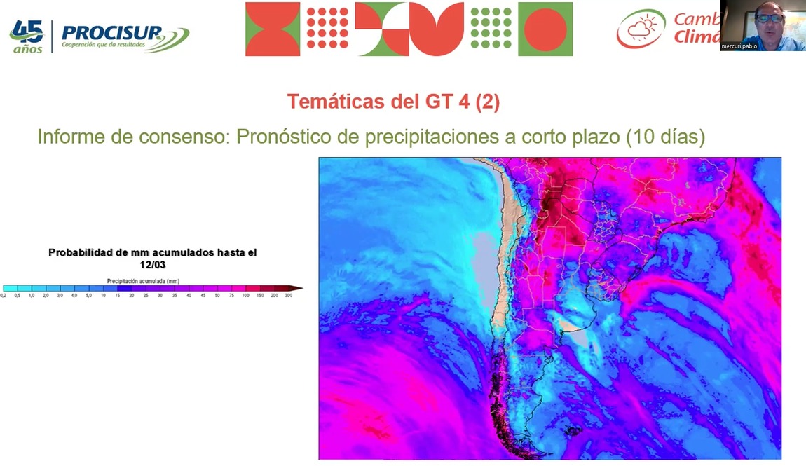 Asimismo, Pablo Mercuri de INTA Argentina, presentó el "Informe de consenso sobre las perspectivas climáticas para Cono Sur, verano-otoño 2026", elaborado por especialistas de los INIA que integran el Programa. Entre sus principales consideraciones, el informe advierte que “las predicciones indican situaciones muy diversas, un mosaico de escenarios con probabilidad de déficit en la oferta de agua en varias áreas de producción agrícola”. Adicionalmente, se detallan posibles impactos del clima esperado en los sistemas agroalimentarios y territorios productivos de Chile, Paraguay, Argentina, Uruguay y Brasil.
